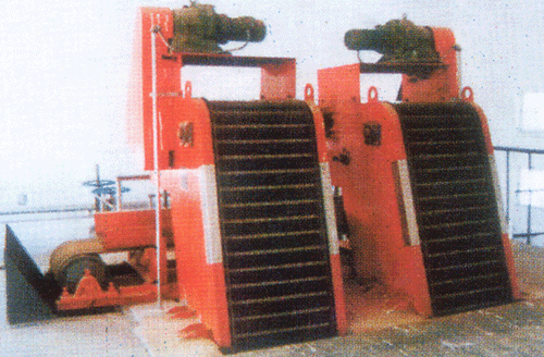 耙齒鏈運(yùn)轉(zhuǎn)到設(shè)備的上部時,由于槽輪和彎軌的導(dǎo)向,使每組耙齒之間產(chǎn)生相對自清運(yùn)動,絕大部分固體物質(zhì)靠重力落下。另一部分則依靠清掃器的反向運(yùn)動把粘在耙齒上的雜物清掃干凈。