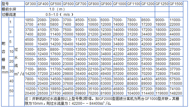設(shè)備規(guī)格按機(jī)寬尺寸分HF300-3600型。機(jī)寬超過1800mm,則做成并聯(lián)機(jī)。耙齒柵隙分為1mm、3mm、5mm、10mm、20mm、30mm、40mm、50mm等各種規(guī)格,選型由過水量、提升高度、固液分離總量和所分離物質(zhì)的形狀、顆粒大小來選擇,同時選配不同的材質(zhì)。