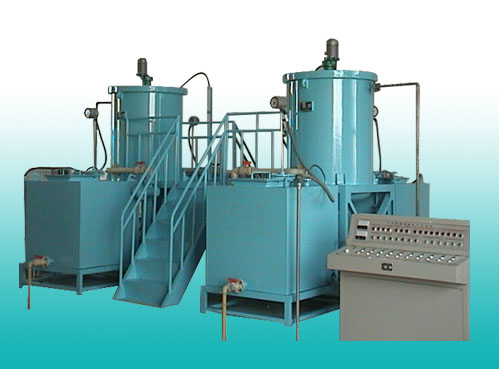 本裝置是粉狀(或液態(tài))高分子凝絮劑的全自動連續(xù)配置及投加系統(tǒng)。干粉絮凝劑從螺旋推進器內(nèi)進入預(yù)混器與清水進行預(yù)混,被濕潤的物料進入配制槽進行稀釋,按要求濃度進行配制;若為液態(tài)絮凝劑則由螺桿泵直接投加到配制槽中。